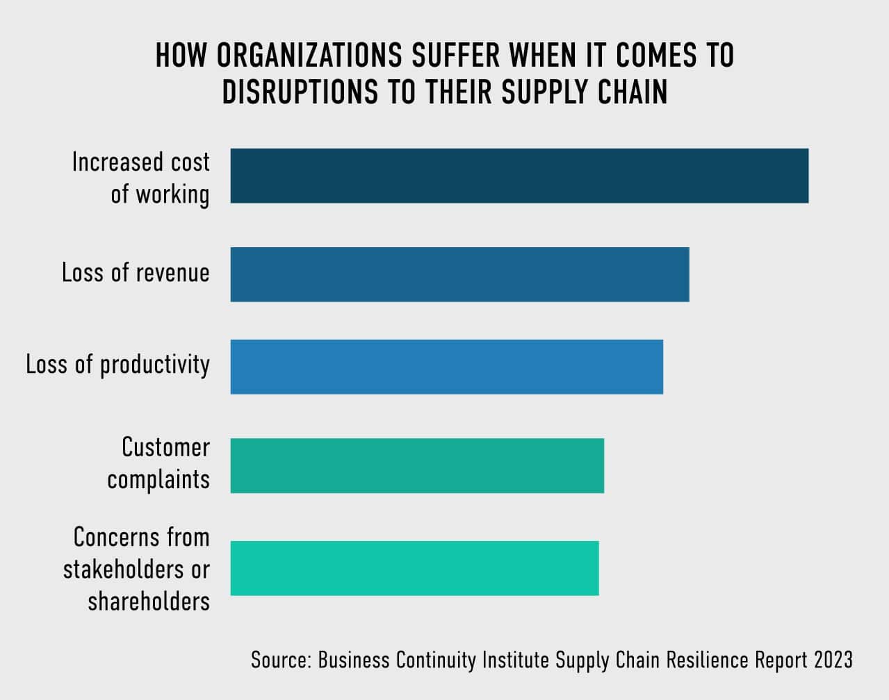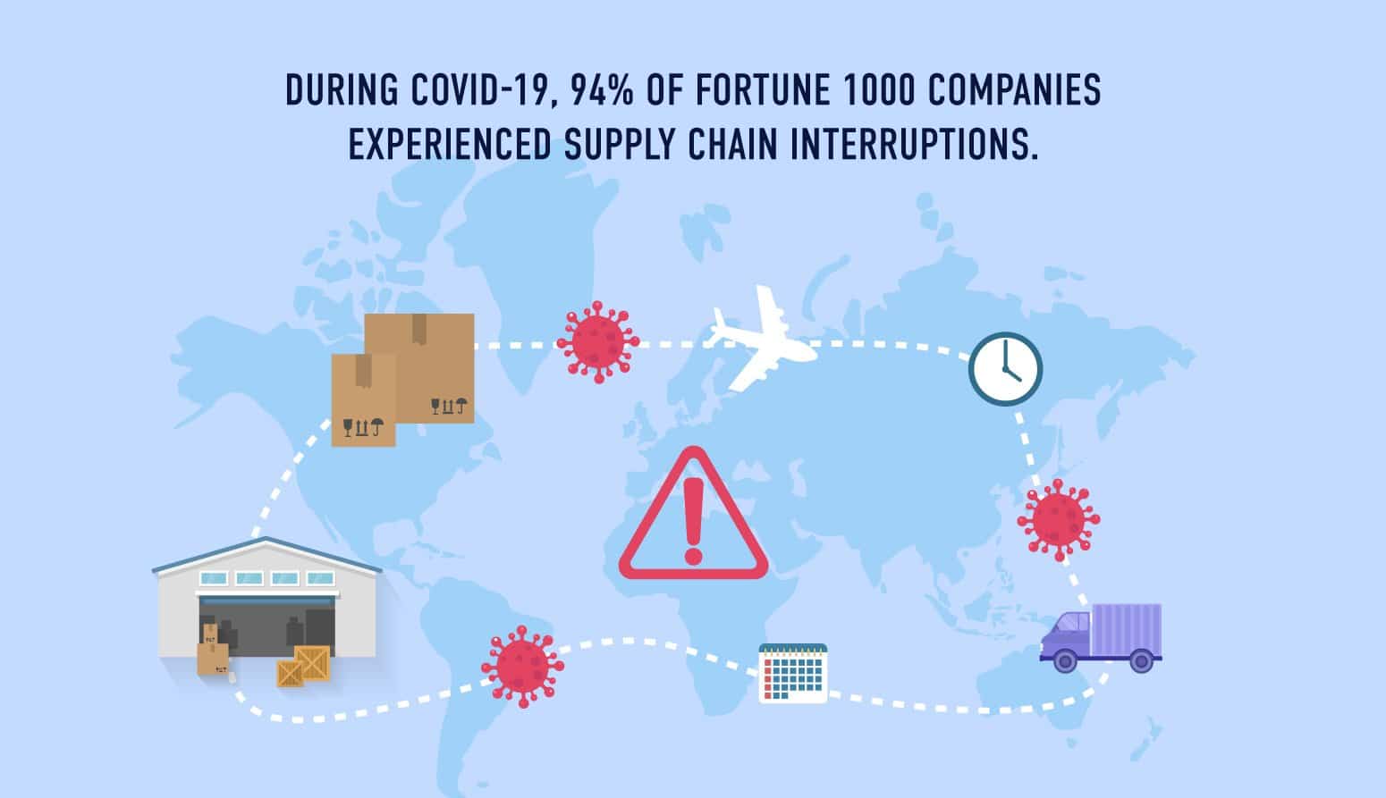 During COVID-19, 94% of Fortune 1000 companies experienced supply chain interruptions. Supply chain disruptions, from unexpected geopolitical tensions to extreme weather events, have become alarmingly common. The pandemic, low ship availability, the Suez Canal blockage, and the ongoing wars in the Middle East are just a few major global disruptions of the global supply chain over the last few years.