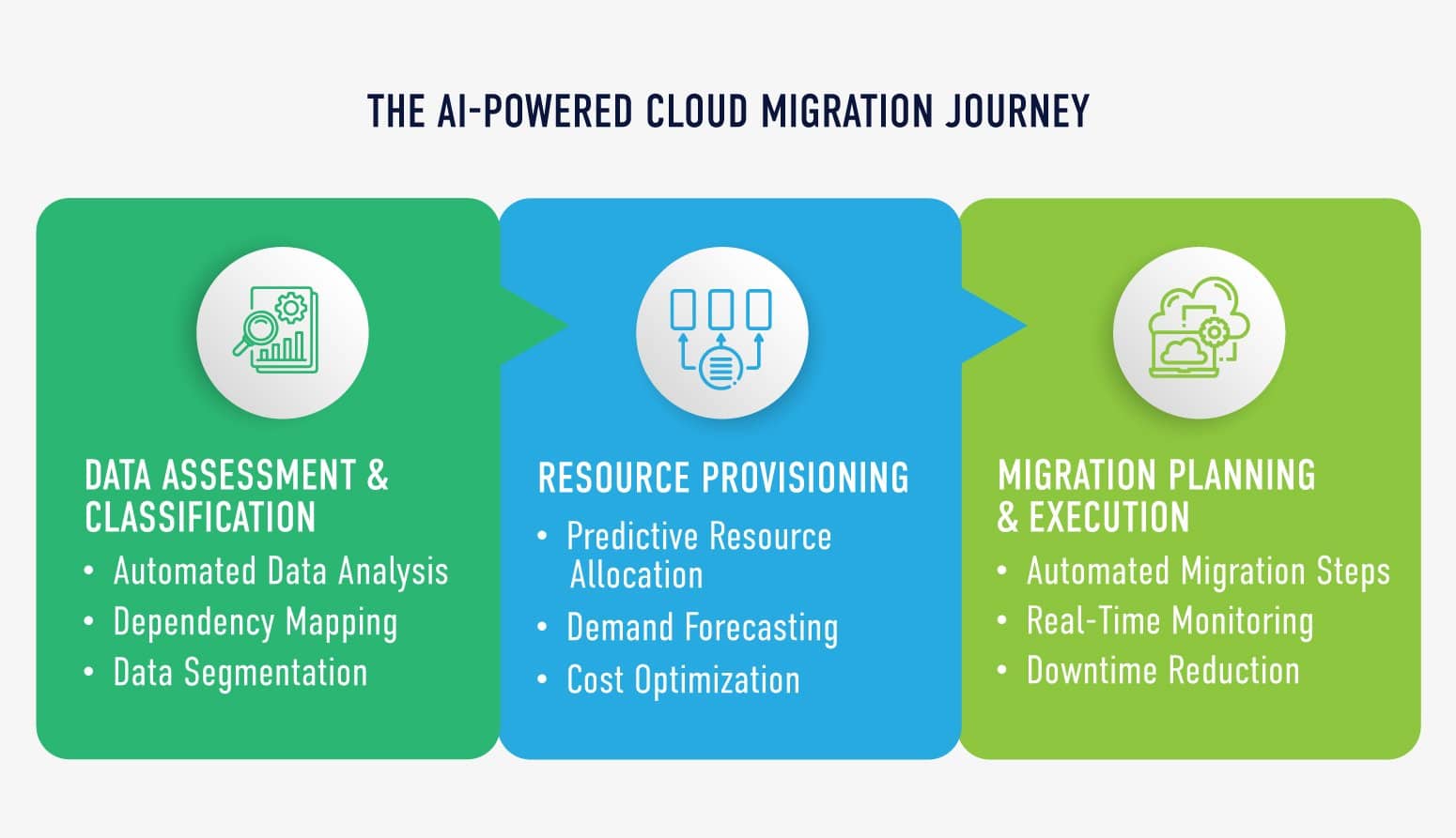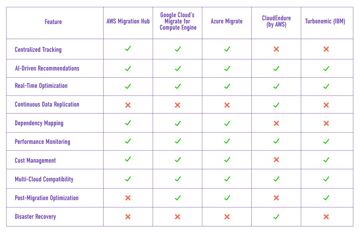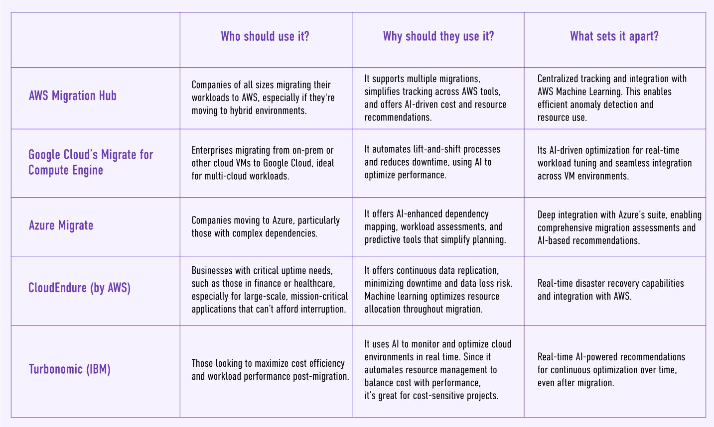 - Migration Planning & Execution: AI-powered tools automate planning and manage the execution of migration steps, monitoring the process for smooth execution and helping avoid the pitfalls of manual migration efforts