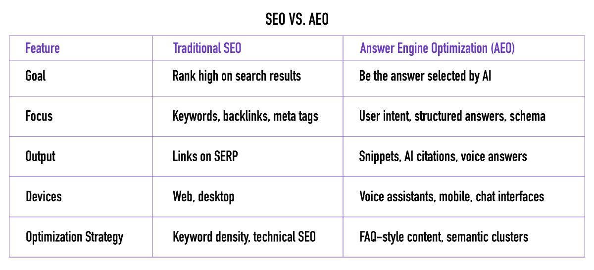 Unlike traditional SEO, which is optimized for blue links and web traffic, AEO is built for answer boxes, zero-click results, and AI summaries. It rewards clarity over creativity, structure over flair, and truth over tone.