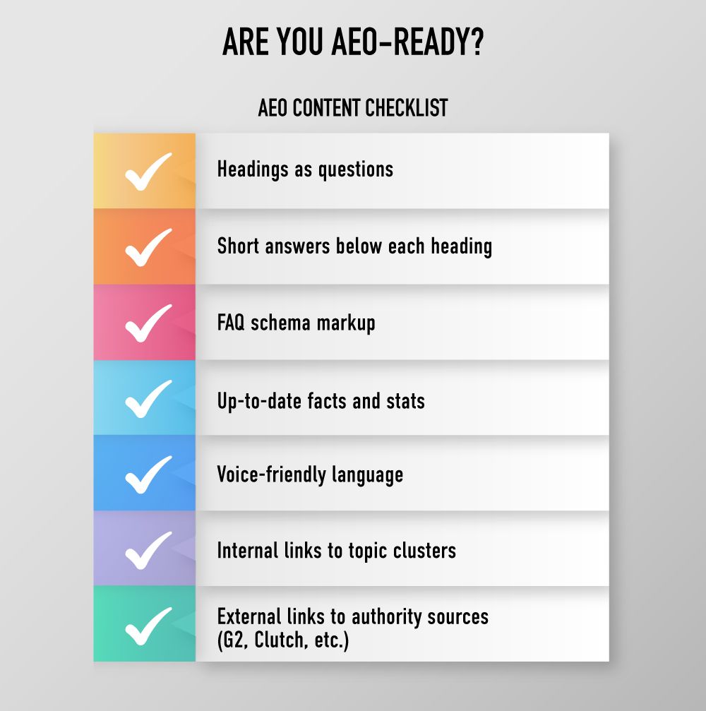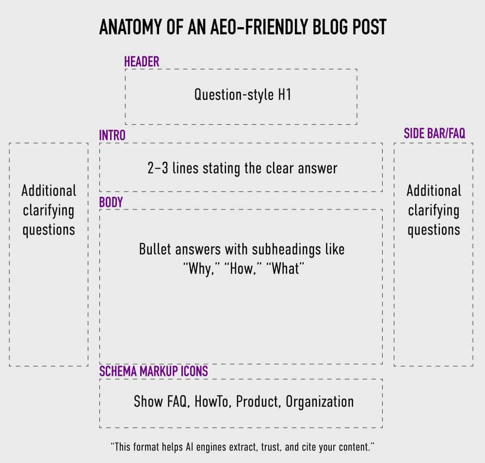 A good AEO-ready paragraph answers the “what,” “how,” and “why” within three sentences. Sprinkle in FAQs throughout your site, not as a formality, but as strategic entry points for voice search and AI snippets.