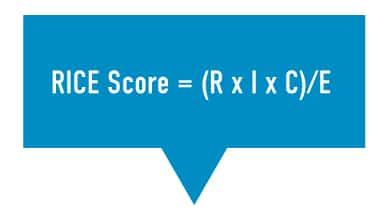 Once you have all these scores, you multiply the scores of R-I-C, and divide it by E. That’s your RICE Score: (High * Medium * Medium) / High = Medium