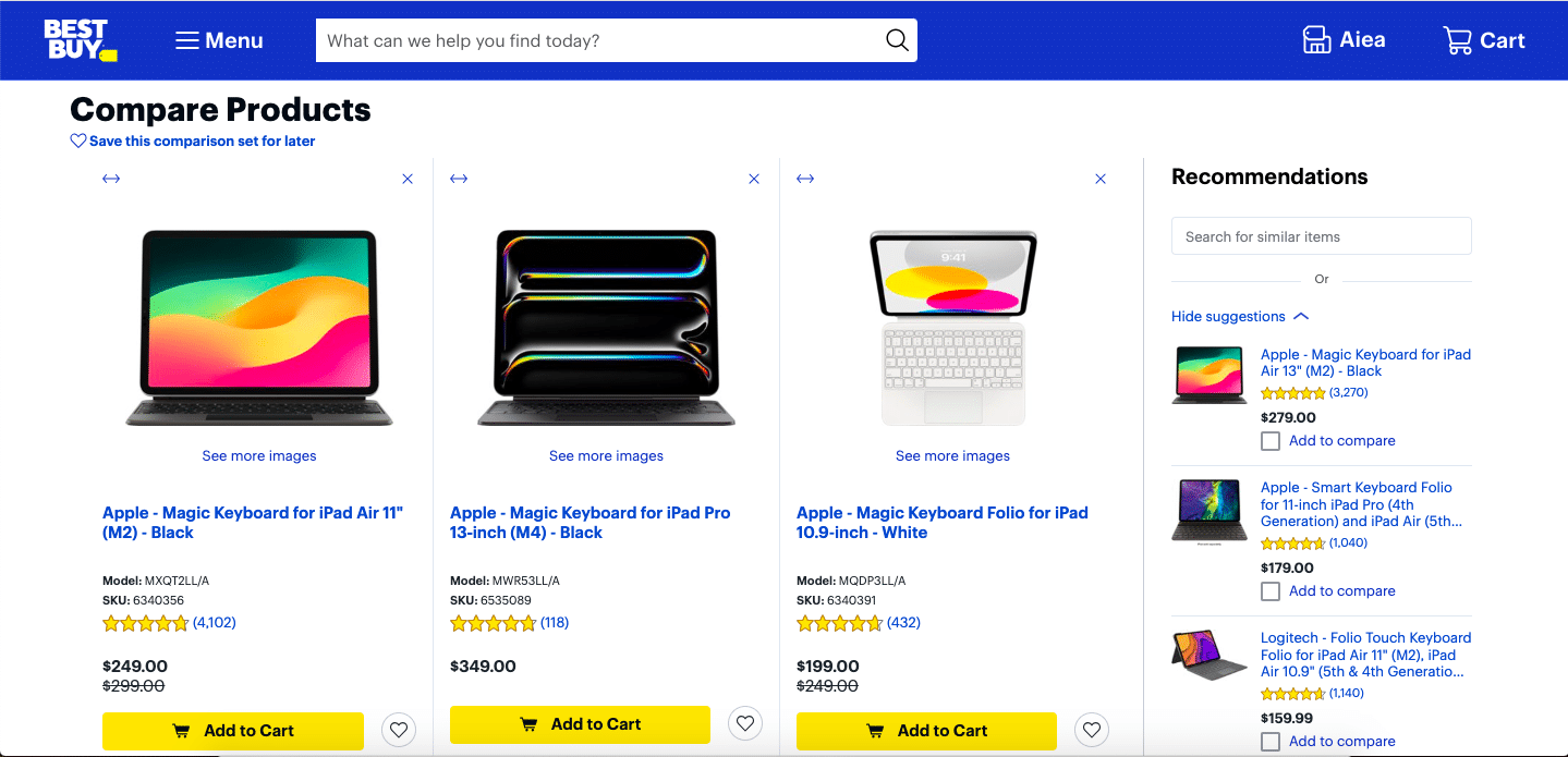 Help buyers break through decision paralysis with comparison tools. If you’re selling a wide range of similar products, a tool of this kind can help customers immensely. For instance, consider Best Buy’s “Compare Products” feature. It allows customers to compare multiple products side by side. This helps them make informed decisions, faster.