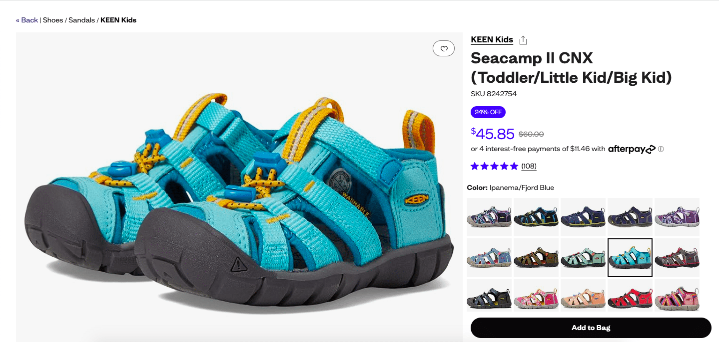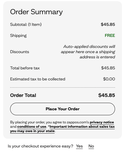 Show shoppers the total cost to be paid, right from the first stage of the shopping journey. By displaying all potential costs clearly, your customers are fully informed. Zappos clearly displays shipping and tax costs and expected delivery times on each product page. This ensures that customers know what to expect, well before checkout.
