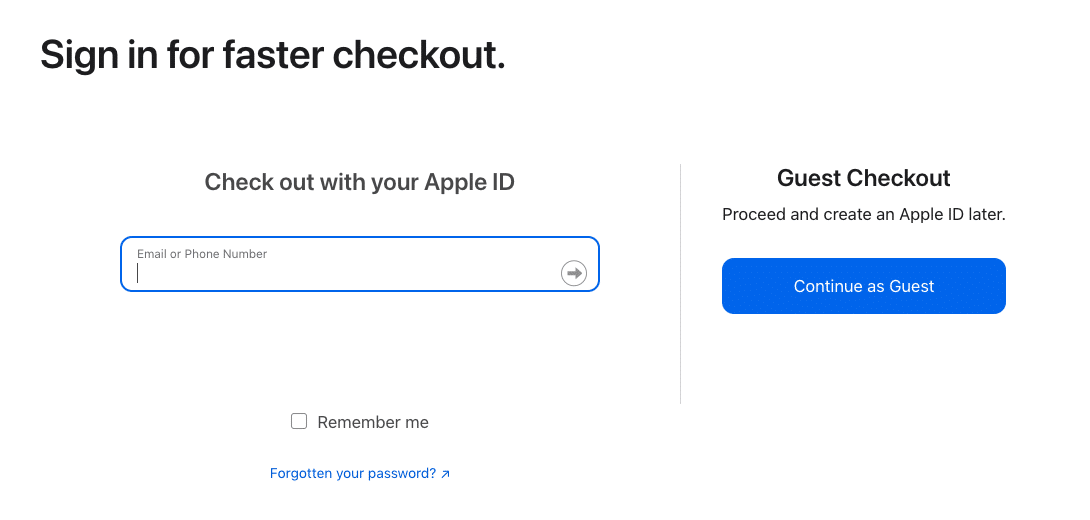 Why do your customers need to create an account on your website? From their point of view, it may not be of much value. Allow customers the option to purchase without an account. For example, Apple also offers a guest checkout option. This lets customers check out with fewer steps. It gives them less time to overthink their choices!