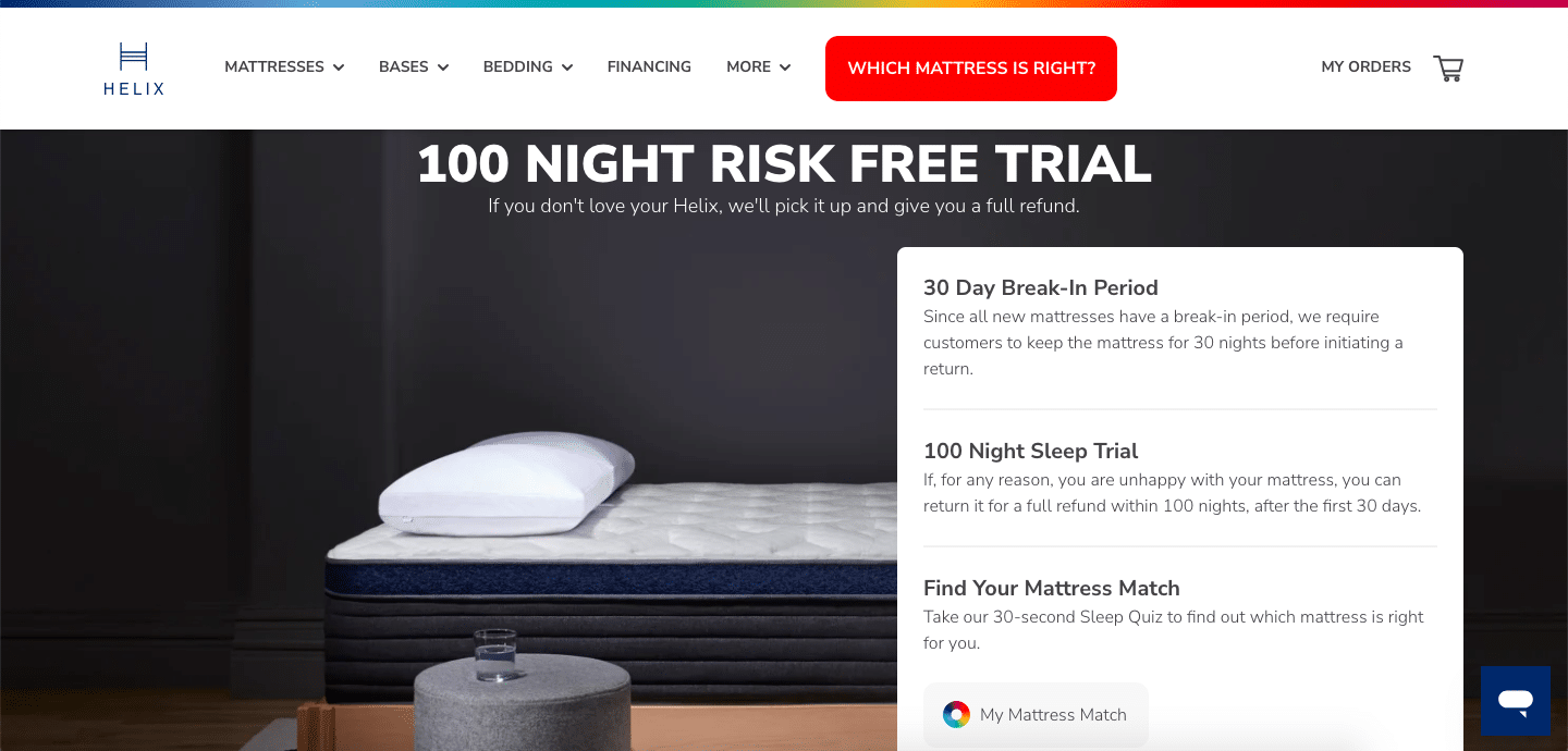 First-time buyers may be concerned. Increase trust and ease decision making with returns, trials and money-back guarantees. Such guarantees build customer trust in the value of their purchases. Helix Sleep Mattresses, an online mattress business, offers a 100 Night Sleep Trial. Such a liberal trial offer makes it easier for customers to take the leap and buy the mattress.