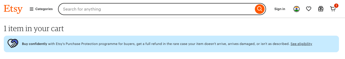 At checkout on Etsy.com, the SSL Certificate and data privacy policy are displayed prominently. They also build trust by featuring their Purchase Protection program. This offers a full refund in case of issues.