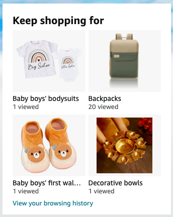If your customers abandon their cart and return to the online store, make it easy for them to keep going. Amazon does this through “Keep shopping for” and “Pick up where you left off” sections on the home page.