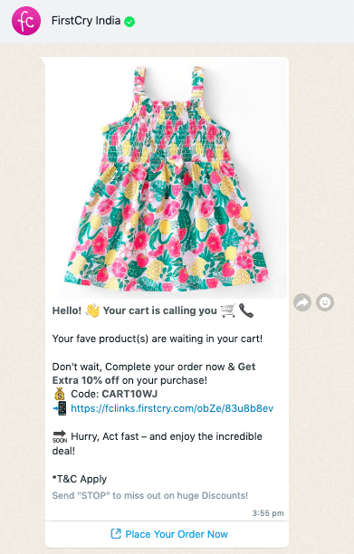 Retargeting communication reminds customers of the products they are interested in. This urges them to return and complete their purchase. Businesses can send email and text reminders about the items left in the carts. Other brands, including Firstcry.com, do the same.
